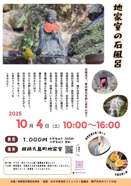 江戸時代初期ごろからある地家室の石風呂は、石積みや岩窟の空洞を利用した熱気浴施設です。地家室の石風呂に、10月4日(土)10時から16時まで···