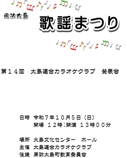 周防大島町内各地区代表50名による生涯学習カラオケ発表会第14回大島連合カラオケクラブ発表会が、10月5日(日)午後1時より大島文化センター···